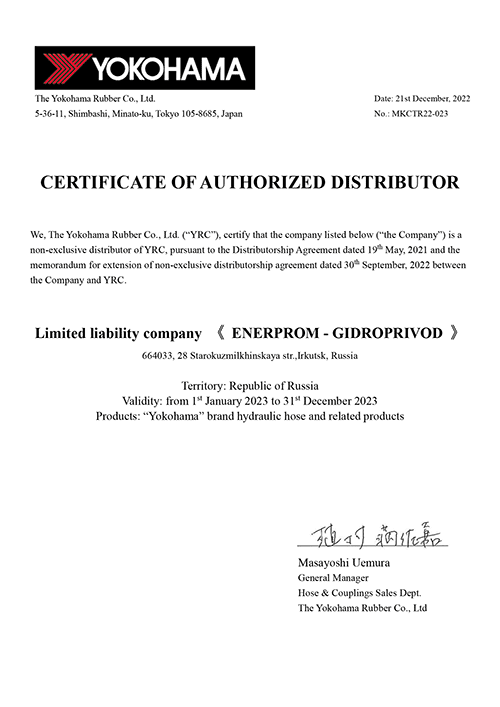 Поэтому предприятие много лет является официальным дистрибьютором рукава высокого давления «Yokohama».